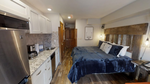- All in one room, queen bed, pull out sofa, and efficiency kitchen.